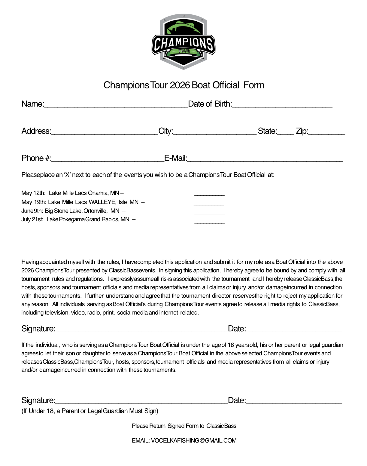 Here are the forms for all events within the 2026 Champions Tour Season. Pro Events, Walleye Event(s), Qualifiers and Pro Ams will all be available to print off and complete before emailing the completed copy.