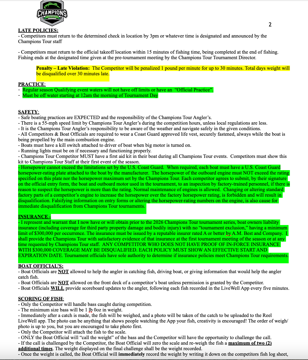 ALL anglers fishing the Champions Tour Qualifying Events MUST HAVE THEIR BOATING Safety Certificate, and a current boat insurance certificate, NO EXCEPTIONS.